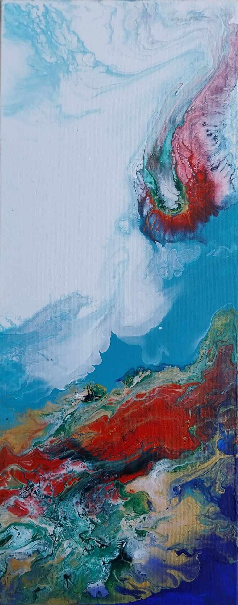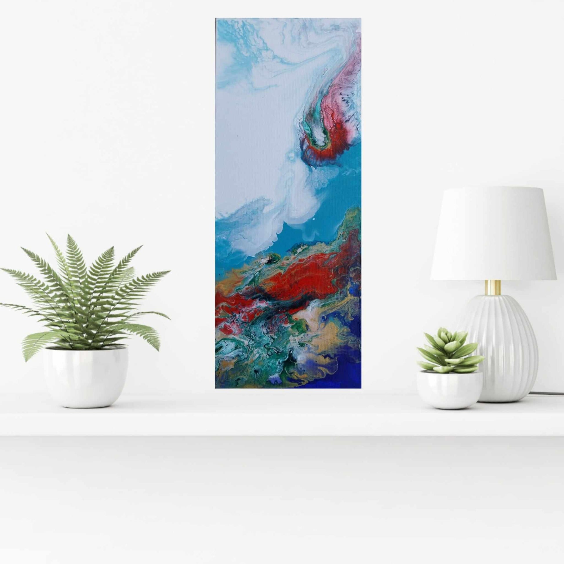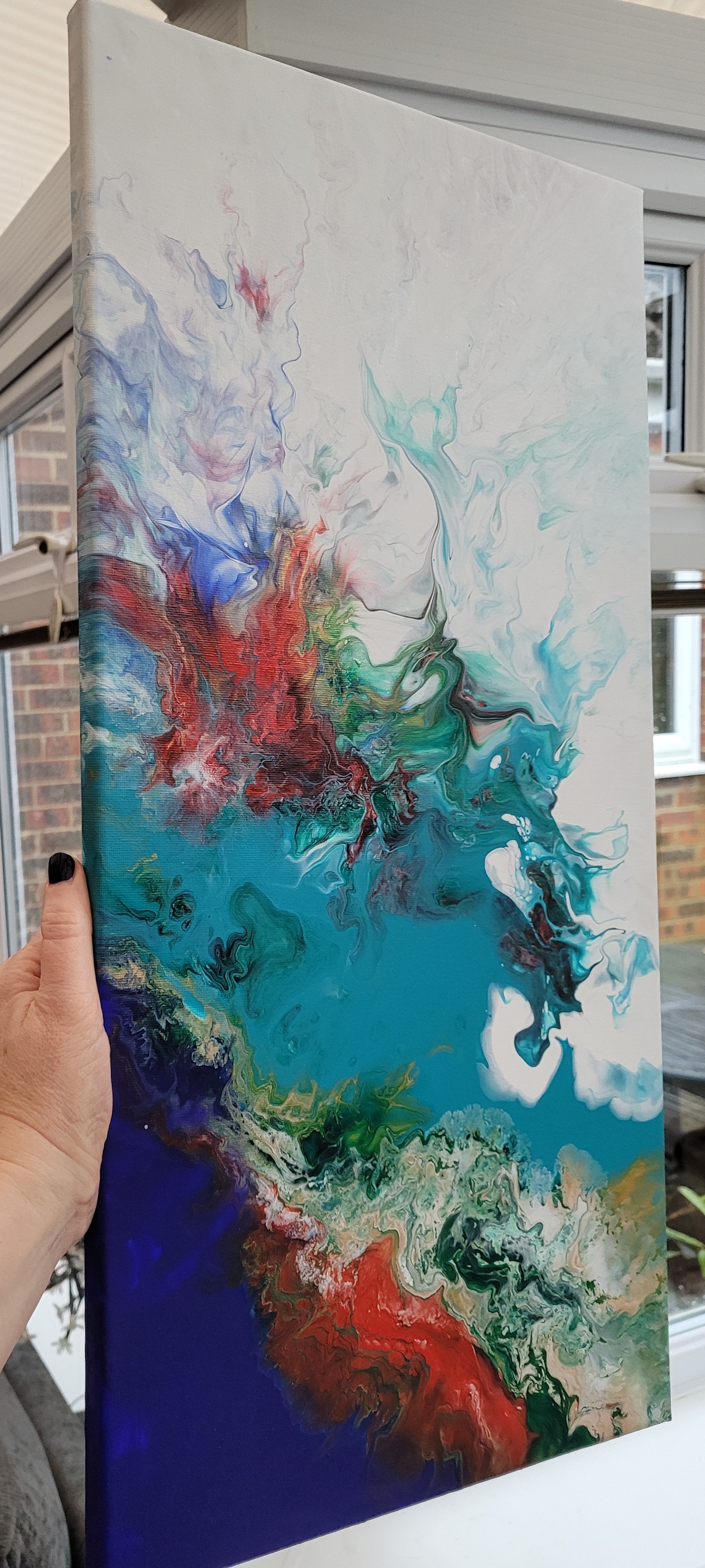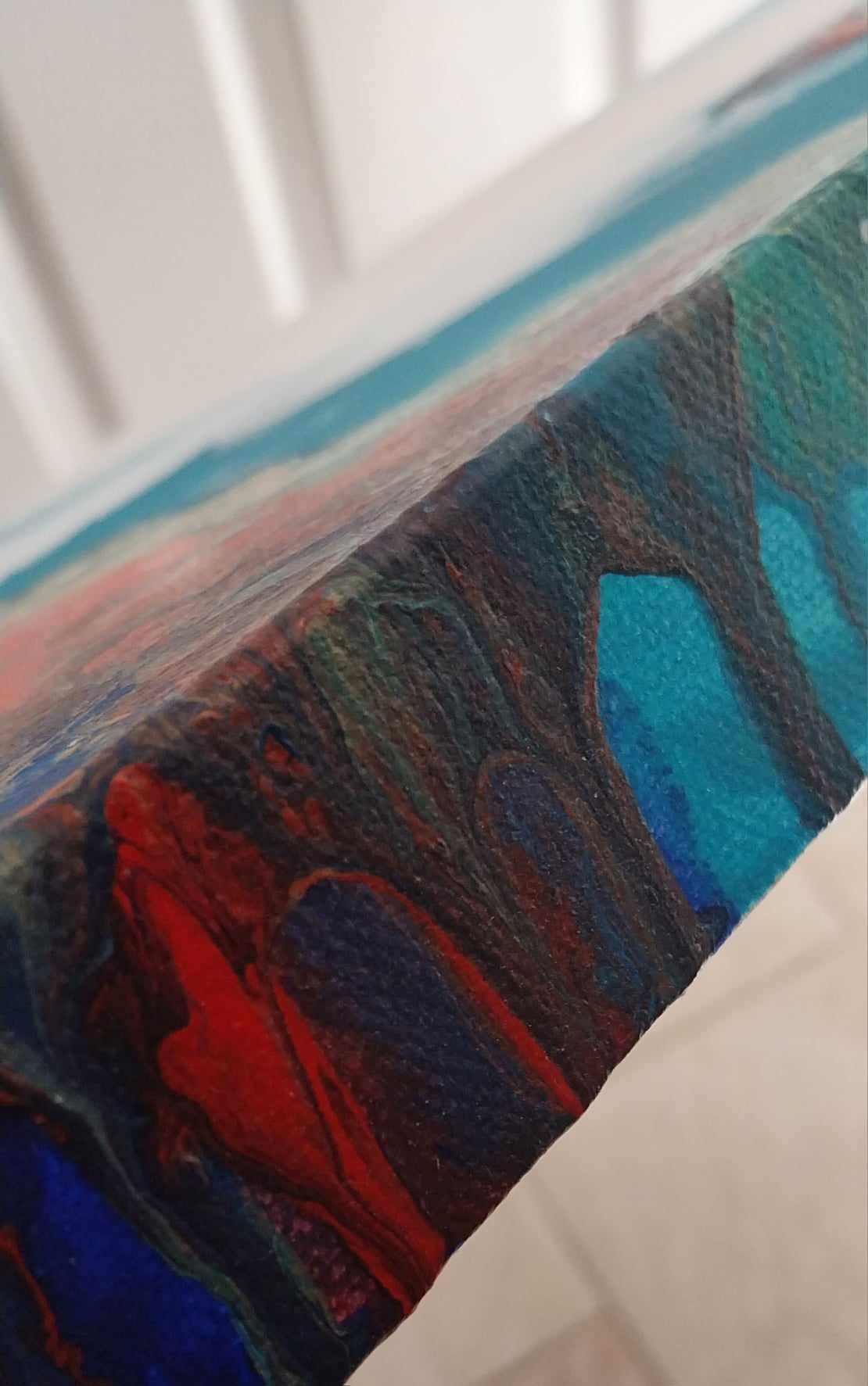 An acrylic pour on a deep edged canvas, Oceans Apart offers a bold pop of pure hues and hints of gold. Measuring 50 cm tall x 20 cm wide x 4 cm deep, the edges are an extension of the painting.
